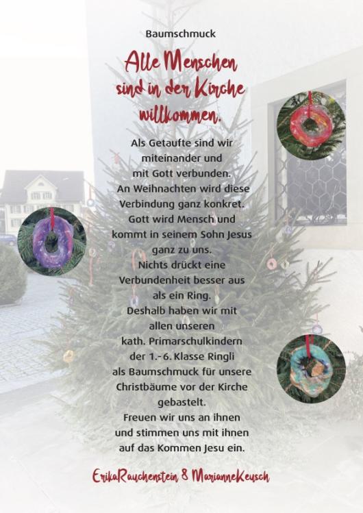 Nichts drückt eine Verbundenheit besser aus als ein Ring. Deshalb haben wir mit allen unseren katholischen Primarschulkindern der 1.-6. Klasse Ringli als Baumschmuck für unsere Christbäume vor der Kirche gebastelt.