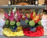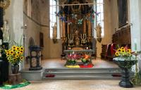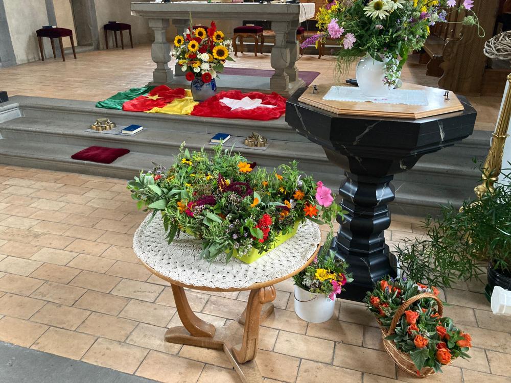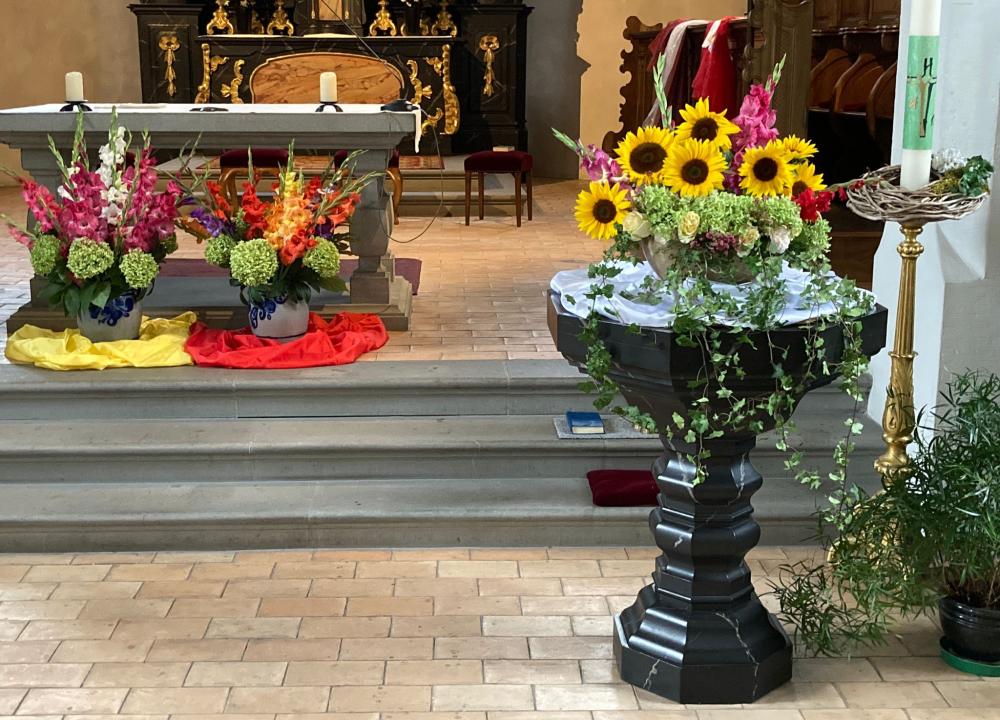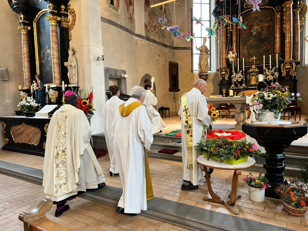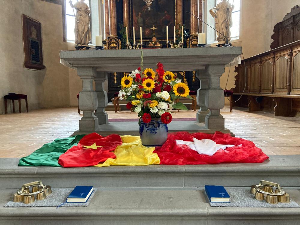 Als Vorbereitung wurde die Kirche von Sakristan Hansueli Müller und seinem Team einladend und wunderschön geschmückt: Blumen und Tüll wurden in den Farben der Flagge von Kamerun zusammengestellt. Die Flaggen von Kamerun und der Schweiz wurden wie bei einem hohen Staatsbesuch vor dem Altar präsentiert.