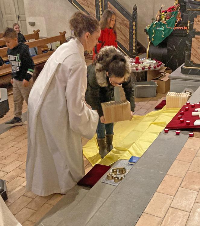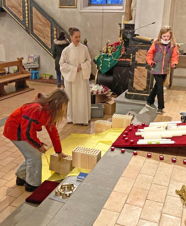 Damit sie sich die damaligen Ereignisse wenigstens ein bisschen vorstellen konnten, haben wir mit Symbolen die Stadt Jerusalem, den Tempel und Jesus als Licht der Welt darzustellen versucht.