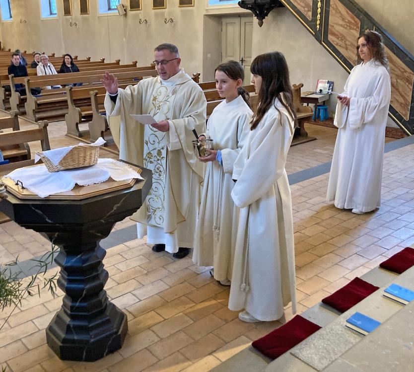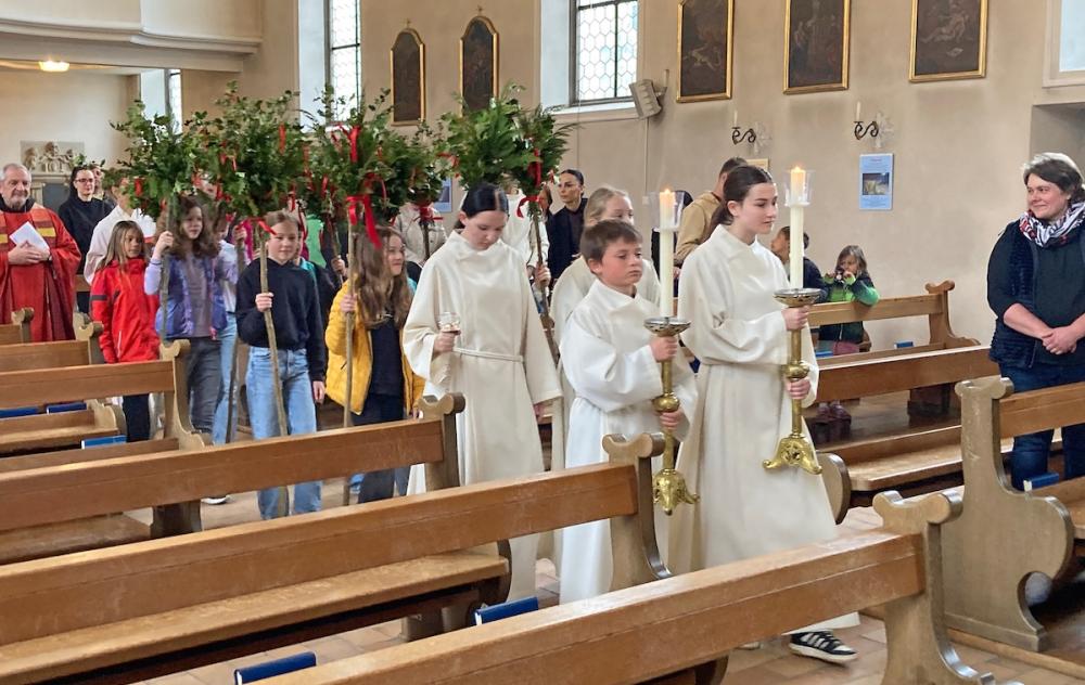 Schon kurze Zeit nach dem Gottesdienst waren die vor der Kirche bereitgestellten Körbe mit den gesegneten Palmen leer. Passanten haben die Palmen mitgenommen. Es ist erstaunlich und schön, dass auch Menschen, die dem Gottesdienst fernbleiben, jedes Jahr Palmzweige als Segenszeichen mit nach Hause nehmen.