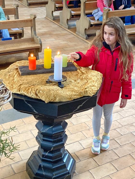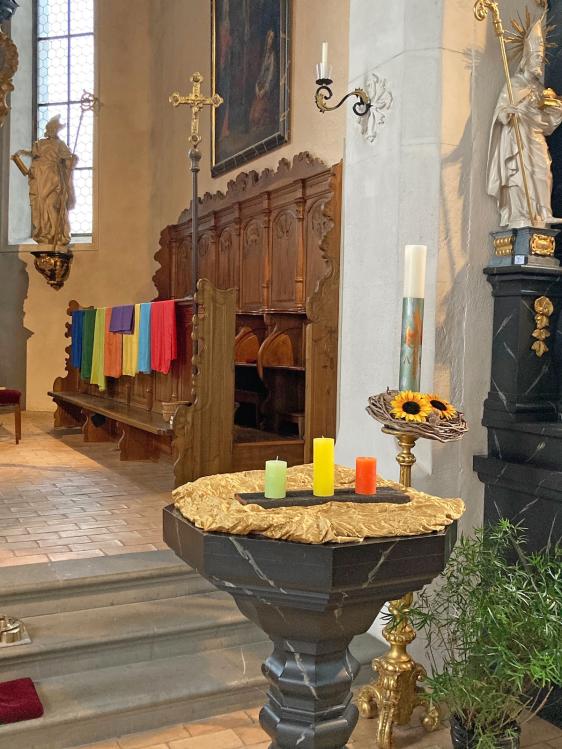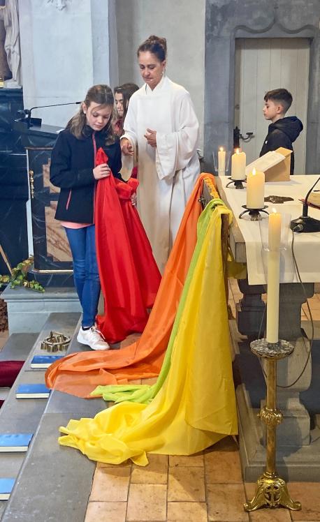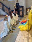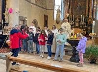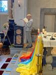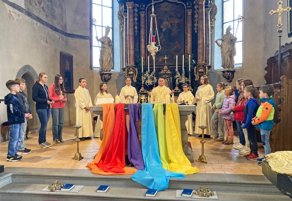 So bunt wie die Farben des Herbstes oder wie ein Regenbogen sind unsere Ministrantinnen und Ministranten. In unserer mit Ballonen, Tüchern, Blätter und Bilder geschmückten Kirche durften wir mit unseren drei neuen Minis weitere Farbtupfer in unsere Schar aufnehmen.