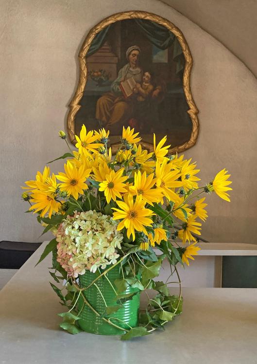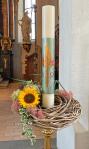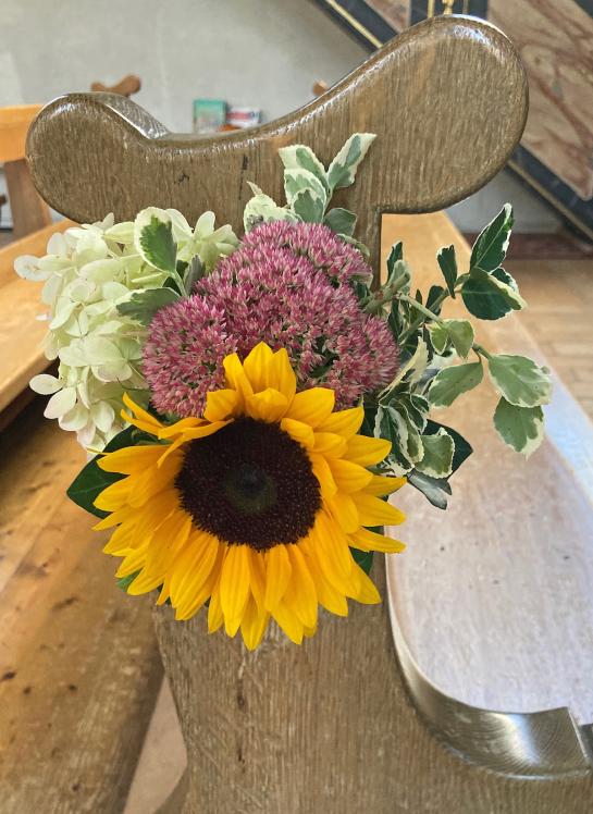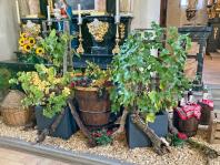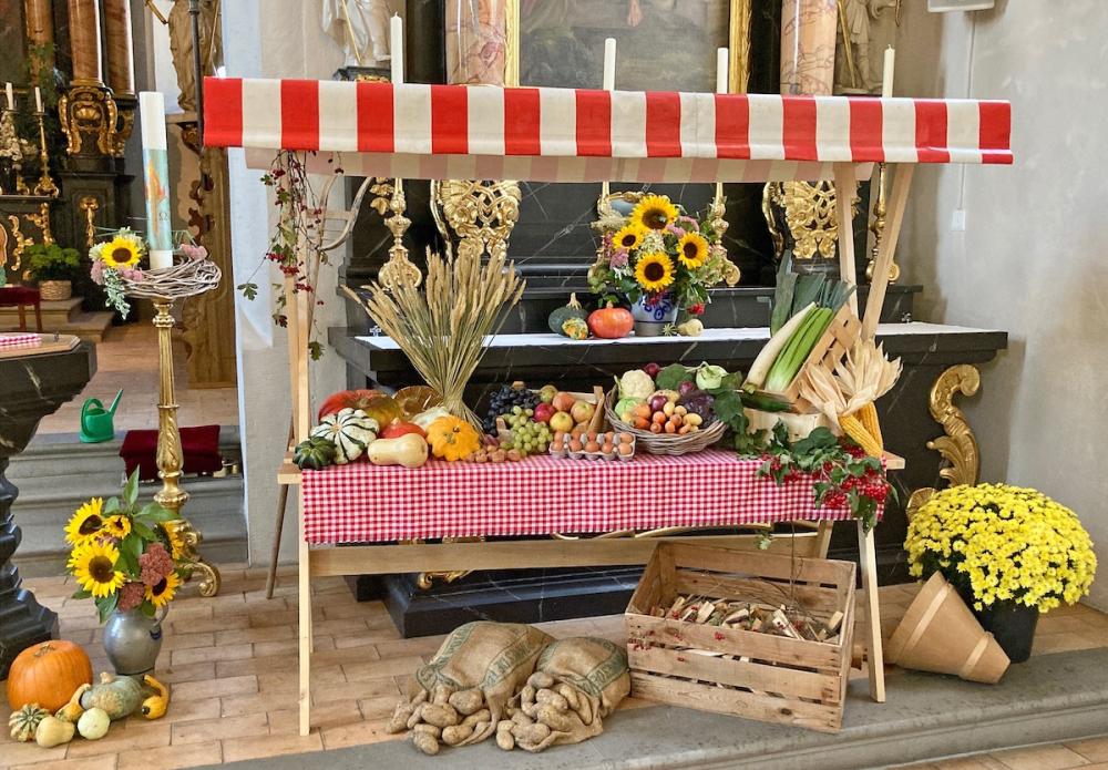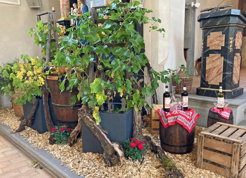 Unser Sigrist Hansueli Müller hat mit seinen zahlreichen Helferinnen und Helfern bei der Dekoration wieder alles gegeben. Neben dem Marktstand, dem mit Gemüse gefüllten Rad und diversen kleineren Dekorationsdetails, lag dieses Jahr der Schwerpunkt auf den Weinreben und den Trauben. Ganz nach dem Thema des Gottesdienstes ‘Gott der kleinen Dinge’.